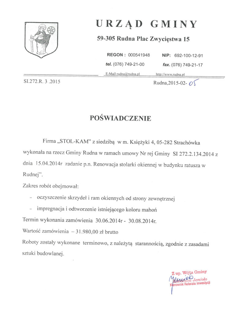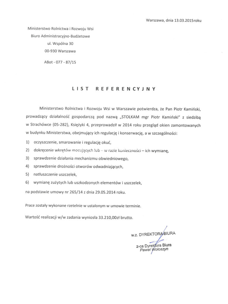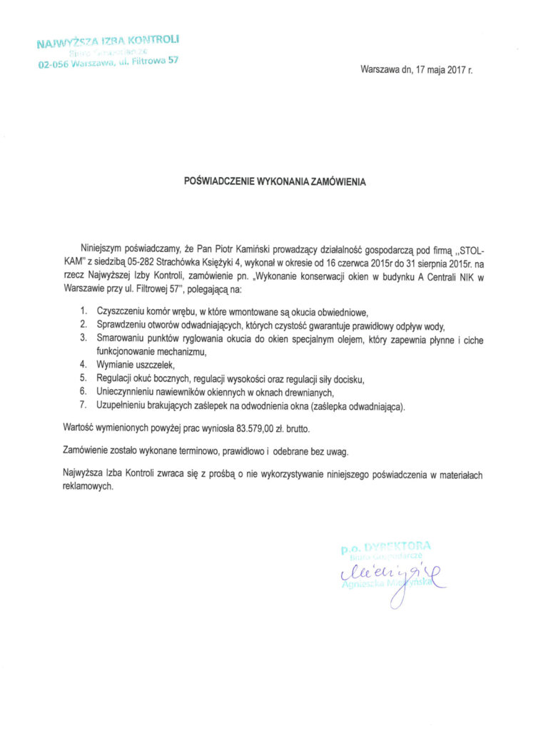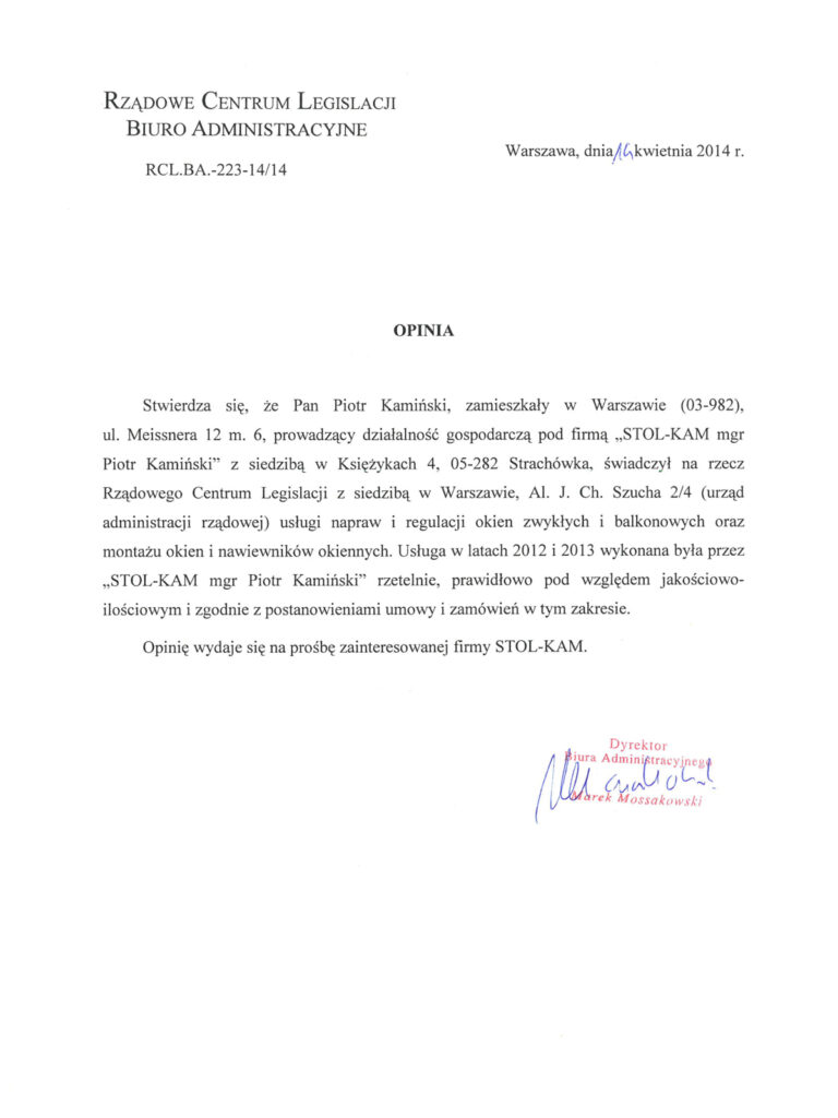 „Świadczył na rzecz Rządowego Centrum Legislacji z siedzibą w Warszawie Aleja J. CH. Szucha 2/4 (urząd administracji rządowej) usługi napraw i regulacji okien zwykłych i balkonowych oraz montażu okien i nawiewników okiennych”